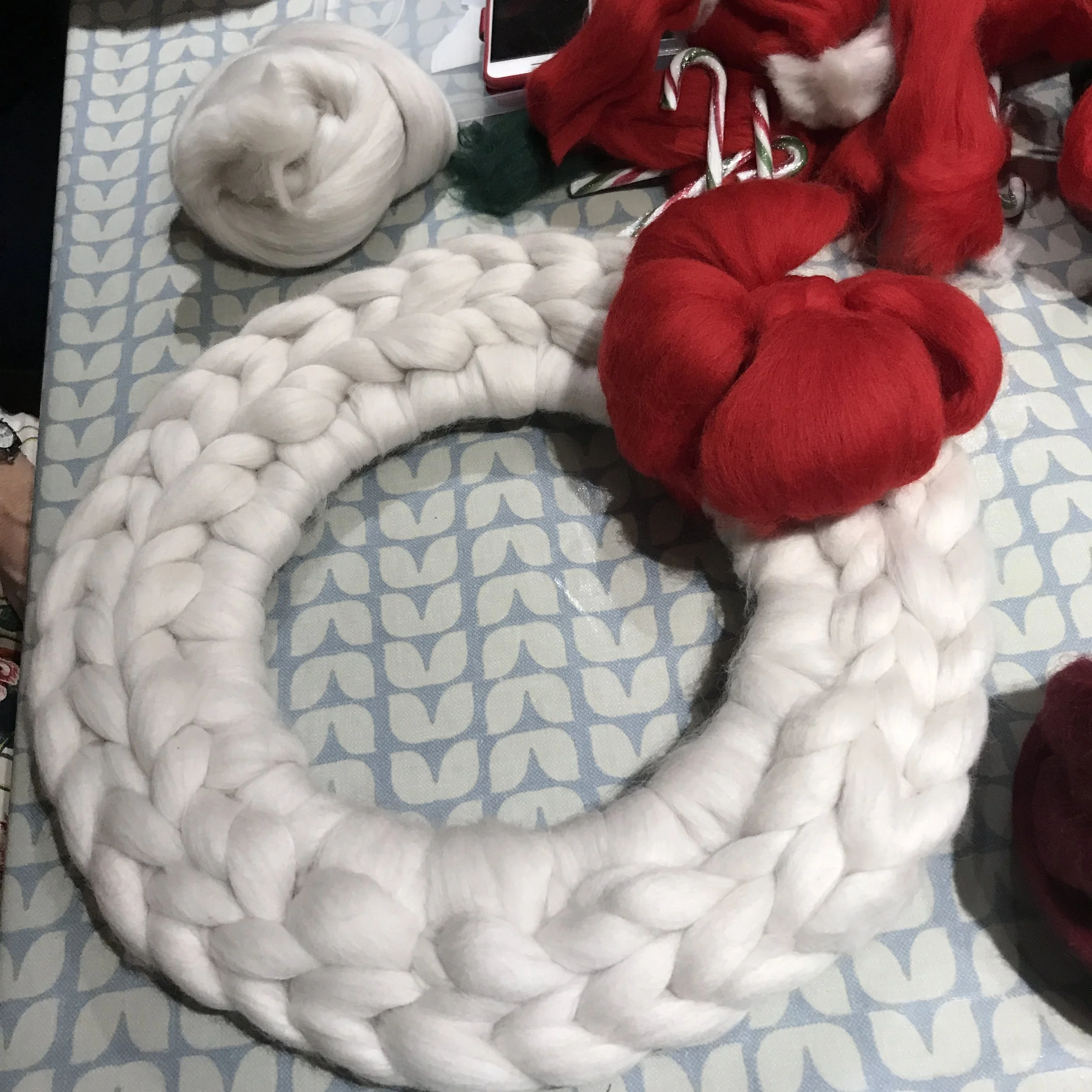 2 hours of instruction, hot drinks, cakes, access to secret online instructional page, finished chunky knit blanket or wreath, laughs and smiles